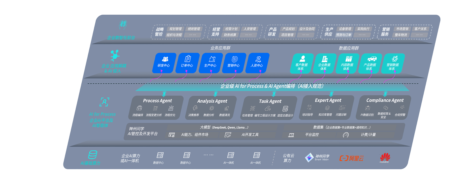 端到端的一站式AI工作空间深度融合了从企业战略规划到日常经营的全流程业务板块,,,定向解决车企内部领域多、、部门多、、链条长、、、场景碎片化等难题,,,支持车企快速构建以AI为核心的生产力写作体系,,,,实现任务执行与AI能力的无缝集成与交互