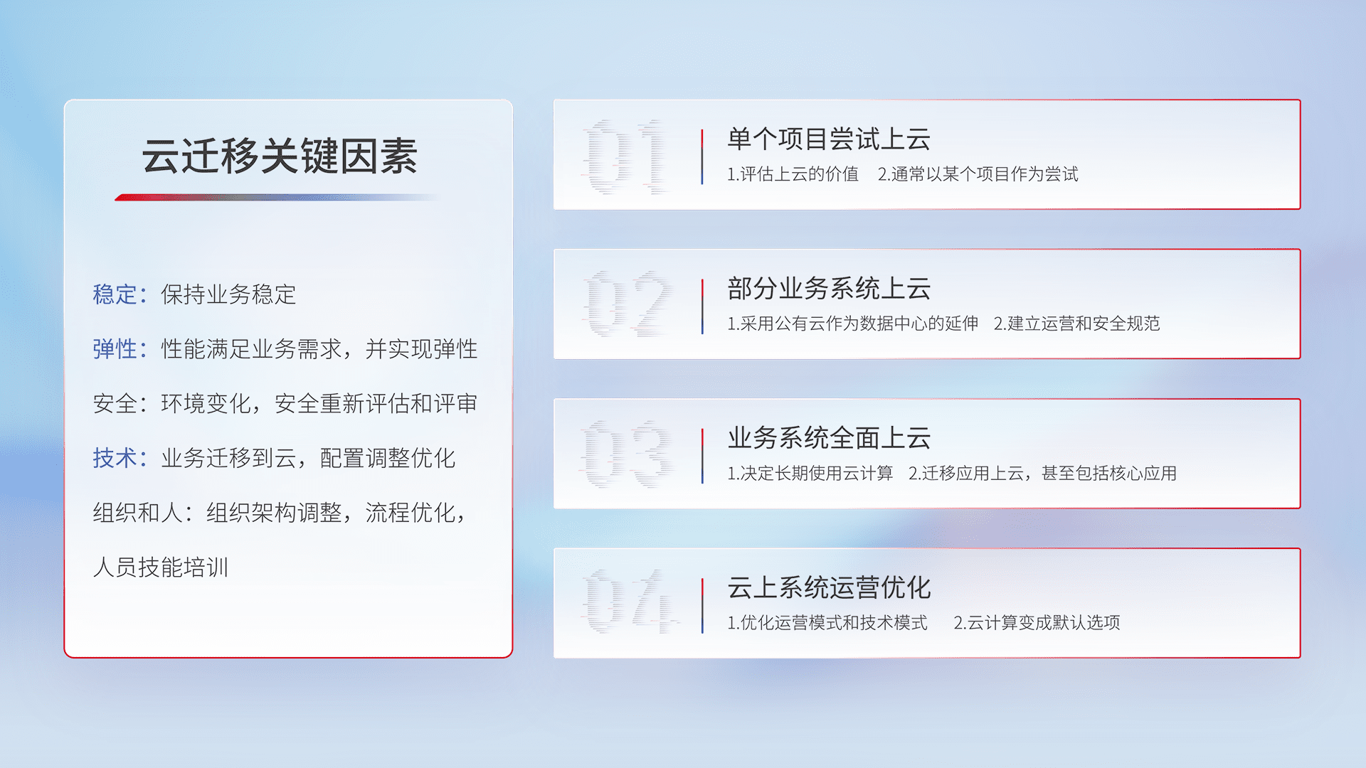 结合实际业务,,,,从规划设计、、云平台选型、、云原生改造、、、、数据迁移、、、集成交付,,迁移全过程为客户识别最佳上云路径,,,做好风险识别管理,,,设计网络架构、、、身份权限、、、、安全审计合规、、操作审计、、、、日志审计、、、、监控告警策略、、、多站点容灾设计等,,对云上基础设施进行整体规划,,提升IT治理水平,,,,以满足弹性、、、高可用、、、高性能的需求。。。。