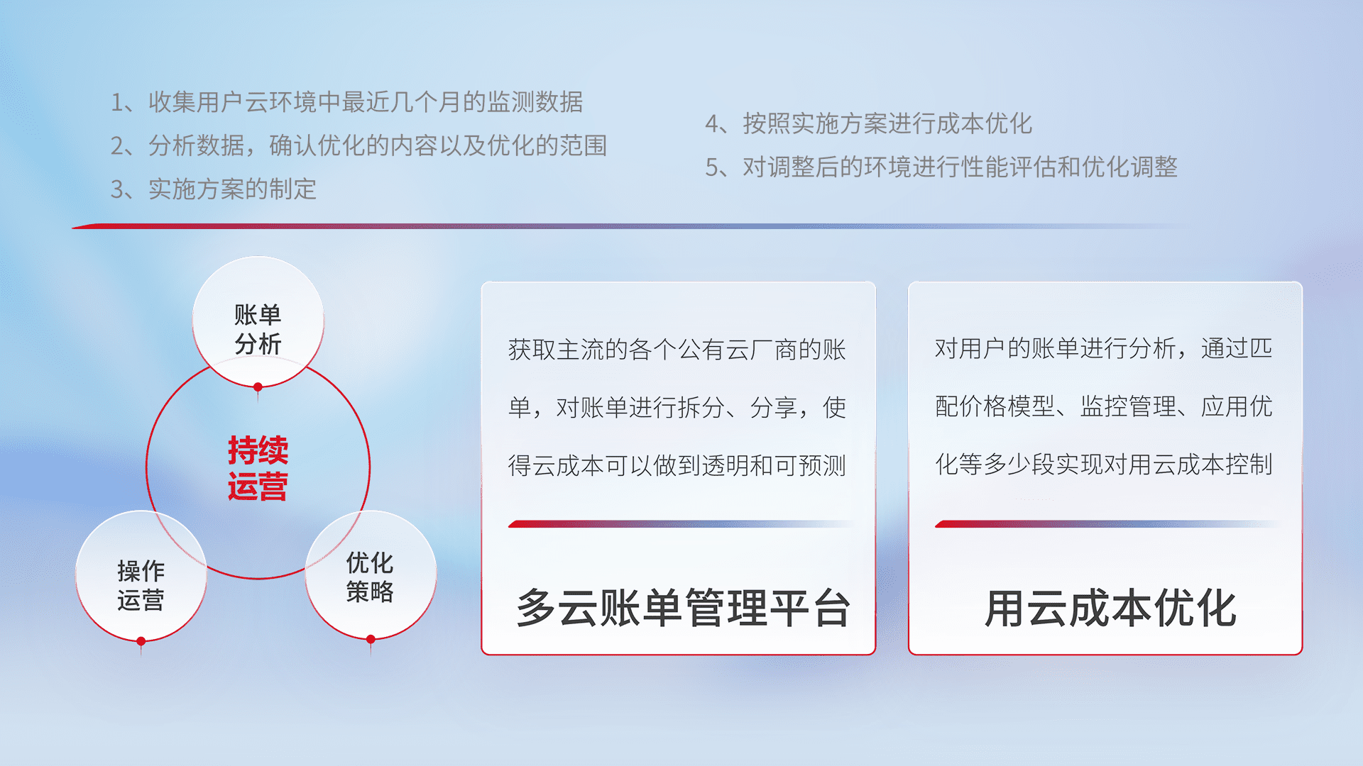 通过多云纳管,,,以统一的资源数据模型把客户的云资源进行抽象和封装,,,进而实现对多云资源的统一操作,,,,保障云资源管理的可靠性、、稳定性与可用性。。量身定制化运维内容,,配置、、开发运维、、补丁管理、、、备份、、监控、、认证和访问管理、、审计和日常巡检等,,保障在用云过程中的可靠度,,,稳定度以及高可用率。。。。