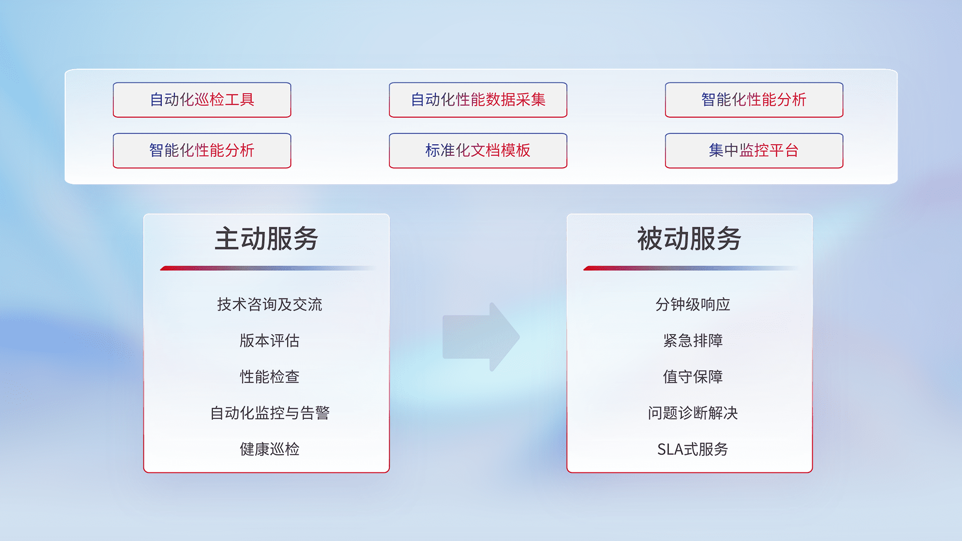 智能化工具和标准化文档,,,,保障服务质量,,,,提供主动服务(包含技术咨询、、版本评估、、、性能检查、、、自动化监控与告警、、、、健康巡检)和被动服务包含(分钟级响应、、、紧急排障、、值守保障、、、、问题诊断解决、、SLA服务)。。。